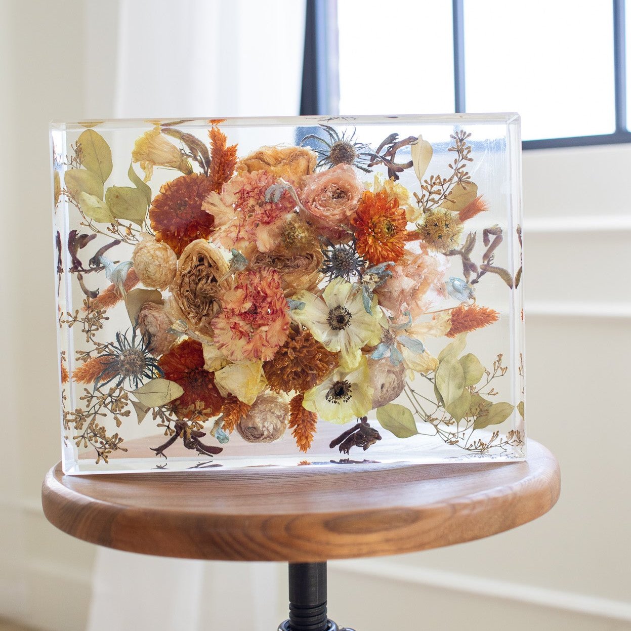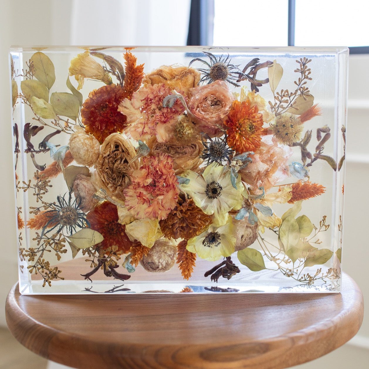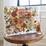 A great medium sized rectangle block, fitting much of your bouquet depending on the size of arrangement and flowers. Can stand vertically or horizontally. A great size for a 5x7 picture, invitation or other memorabilia.