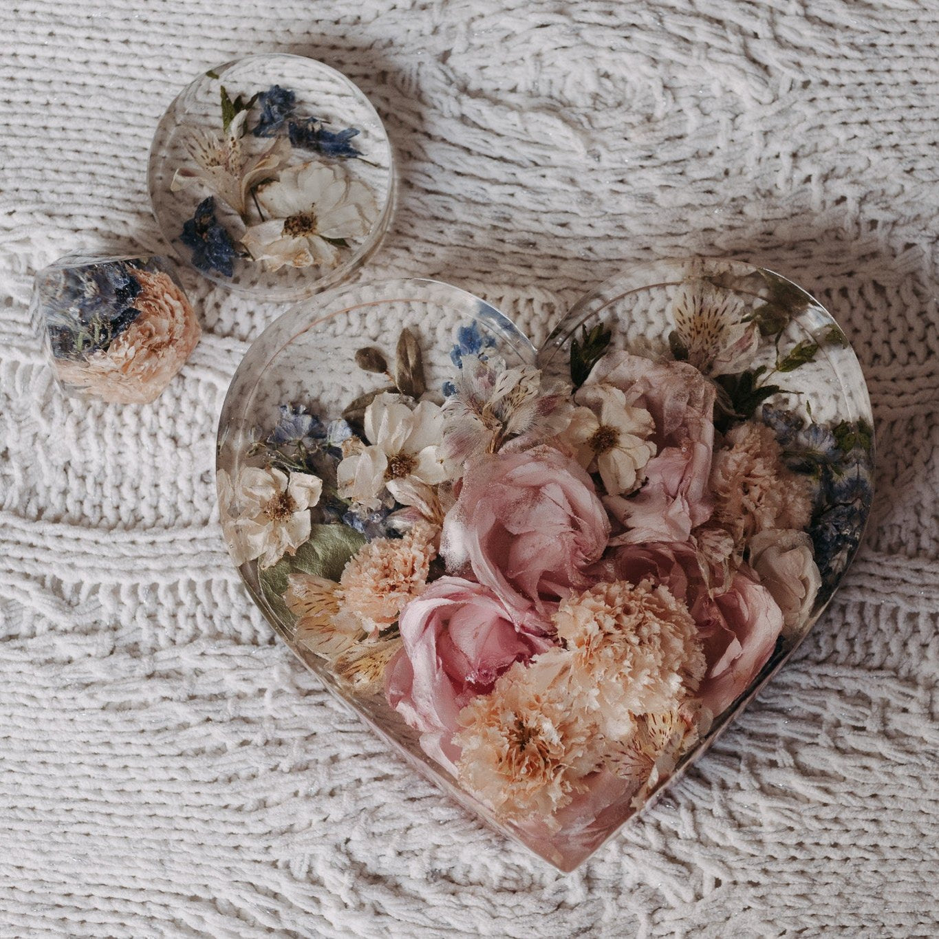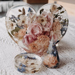 This 9" tall and 10" wide heart is a unique way to incorporate a different look while preserving your flowers. Holds 7-9 average sized flowers. Can fit a picture or invitation but not as comfortably as larger blocks. Fits other memorabilia.